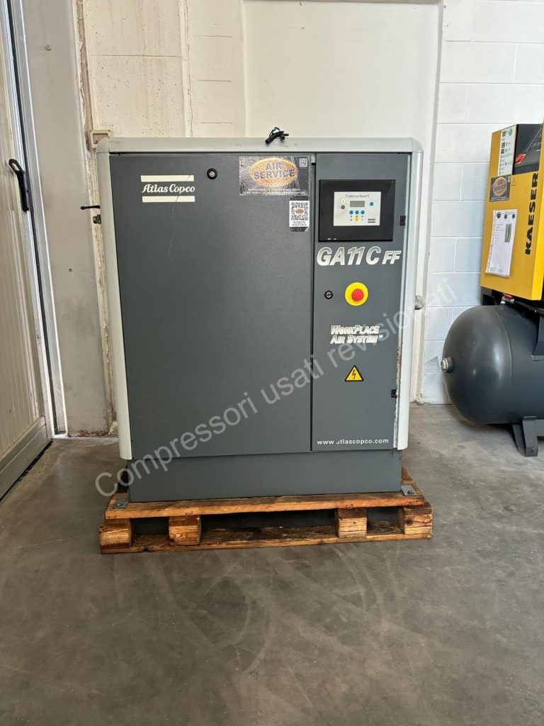 Il compressore Atlas Copco GA 11 C FF è un compressore a vite con trasmissione a cinghia costruito nel 2005. Con una potenza di 11 kW ( 15 Hp) il compressore fornisce una portata massima di 1.470 litri al minuto e opera a una pressione massima di 9,80 bar. Dotato di Essiccatore Integrato. Alimentazione a 400 Volt.