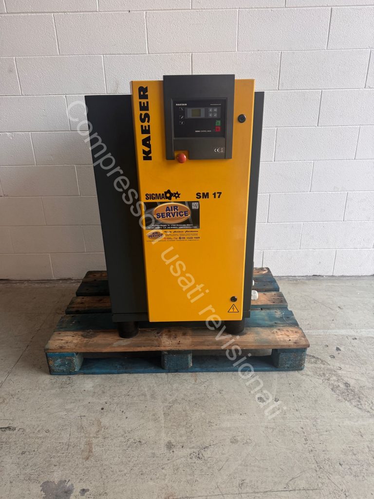 Il compressore Kaeser SM 17 è un’unità a vite del 2012, progettata per offrire alta efficienza e affidabilità. Con una potenza di 11 kW ( 15 Hp) il compressore fornisce una portata massima di 1.500 litri al minuto e opera a una pressione massima di 10 bar. Alimentazione a 400 Volt. Trasmissione a cinghia Vite – Motore. Viene fornito con una garanzia di 6 mesi.