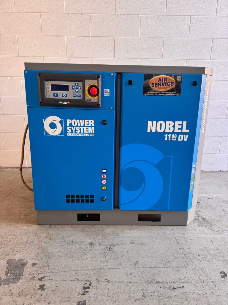 Il compressore Powersystem NOBEL 11-10 DV è un compressore a vite con una potenza di 11 kW ( 15 Hp). Dotato di inverter, il compressore fornisce una portata massima di 1.580 litri al minuto e una portata minima di 620 litri al minuto e opera a una pressione massima di 10 bar. Costruito nell’anno 2020 e con Gruppo vite sostituito in anno 2024 con 29.500 ore totali. Alimentazione a 400 Volt. Trasmissione diretta Vite – Motore . Viene fornito con una garanzia di 6 mesi sulle parti meccaniche.